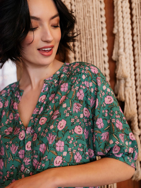 We're so happy with this new pattern for a lovely blouse with raglan sleeves and elegant popover placket! Olivia has medium length sleeves, a nice gather at the collar and a slightly rounded hem. Or maybe you prefer making the dress? They are both included in this double pattern!